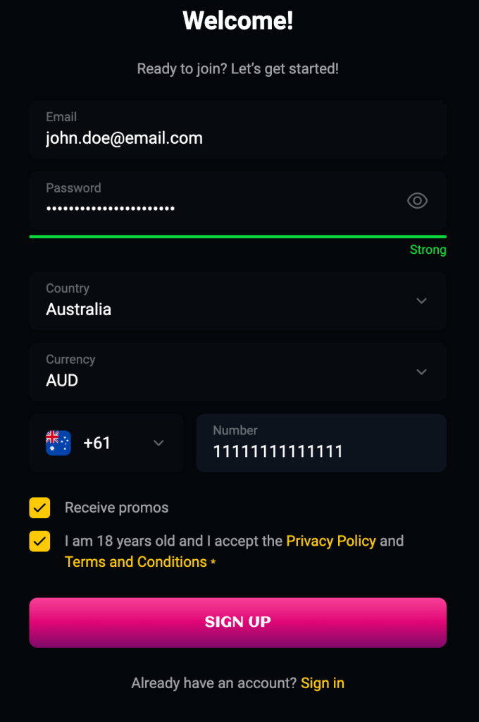 - Tick the checkbox to confirm your legal age and agree to the Terms and Conditions and Privacy Policy.